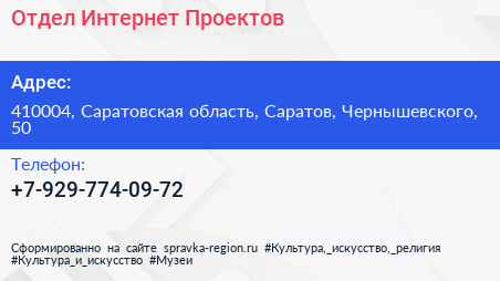 Отдел Интернет-Проектов по адресу 410004, Саратовская область, Саратов, Чернышевского, 50 в дальнейшем Организация, размещена в следующих категориях: