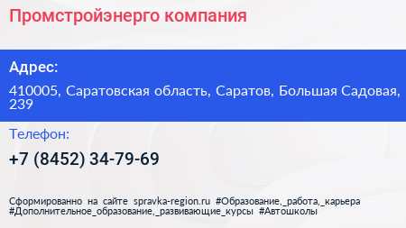 Промстройэнерго, компания по адресу 410005, Саратовская область, Саратов, Большая Садовая, 239 в дальнейшем Организация, размещена в следующих категориях: