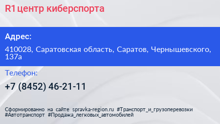 R1, центр киберспорта по адресу 410028, Саратовская область, Саратов, Чернышевского, 137а в дальнейшем Организация, размещена в следующих категориях: