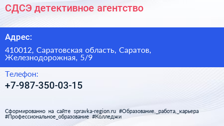 СДСЭ, детективное агентство по адресу 410012, Саратовская область, Саратов, Железнодорожная, 5/9 в дальнейшем Организация, размещена в следующих категориях: