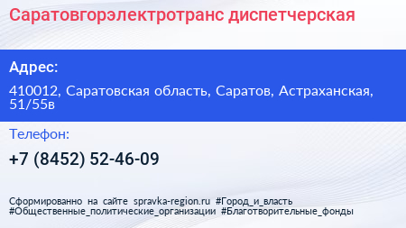 Саратовгорэлектротранс, диспетчерская по адресу 410012, Саратовская область, Саратов, Астраханская, 51/55в в дальнейшем Организация, размещена в следующих категориях: