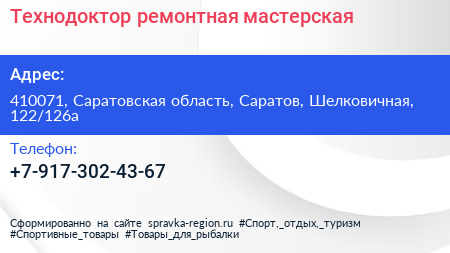 Технодоктор, ремонтная мастерская по адресу 410071, Саратовская область, Саратов, Шелковичная, 122/126а в дальнейшем Организация, размещена в следующих категориях: