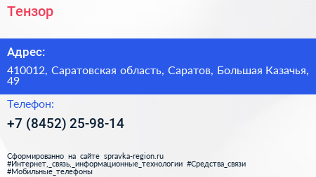 Тензор по адресу 410012, Саратовская область, Саратов, Большая Казачья, 49 в дальнейшем Организация, размещена в следующих категориях: