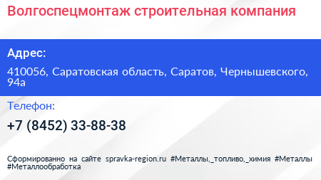 Волгоспецмонтаж, строительная компания по адресу 410056, Саратовская область, Саратов, Чернышевского, 94а в дальнейшем Организация, размещена в следующих категориях: