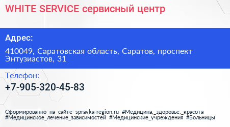 WHITE SERVICE, сервисный центр по адресу 410049, Саратовская область, Саратов, проспект Энтузиастов, 31 в дальнейшем Организация, размещена в следующих категориях: