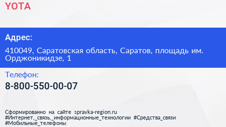 YOTA по адресу 410049, Саратовская область, Саратов, площадь им. Орджоникидзе, 1 в дальнейшем Организация, размещена в следующих категориях: