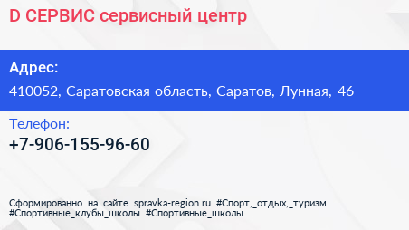 D-СЕРВИС, сервисный центр по адресу 410052, Саратовская область, Саратов, Лунная, 46 в дальнейшем Организация, размещена в следующих категориях: