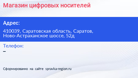 Магазин цифровых носителей по адресу 410039, Саратовская область, Саратов, Ново-Астраханское шоссе, 52д в дальнейшем Организация, размещена в следующих категориях: