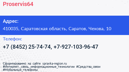Proservis64 по адресу 410035, Саратовская область, Саратов, Чехова, 10 в дальнейшем Организация, размещена в следующих категориях: