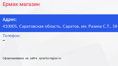 Ермак, магазин по адресу 410005, Саратовская область, Саратов, им. Разина С.Т., 58 в дальнейшем Организация, размещена в следующих категориях: