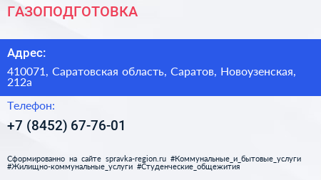 ГАЗОПОДГОТОВКА по адресу 410071, Саратовская область, Саратов, Новоузенская, 212а в дальнейшем Организация, размещена в следующих категориях: