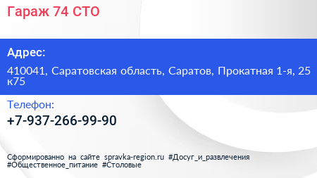 Гараж 74, СТО по адресу 410041, Саратовская область, Саратов, Прокатная 1-я, 25 к75 в дальнейшем Организация, размещена в следующих категориях: