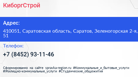 КиборгСтрой по адресу 410051, Саратовская область, Саратов, Зеленогорская 2-я, 51 в дальнейшем Организация, размещена в следующих категориях: