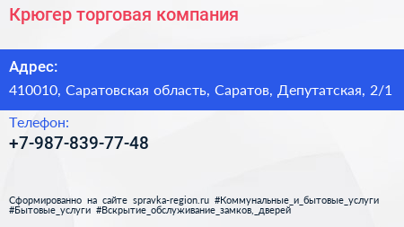 Крюгер, торговая компания по адресу 410010, Саратовская область, Саратов, Депутатская, 2/1 в дальнейшем Организация, размещена в следующих категориях: