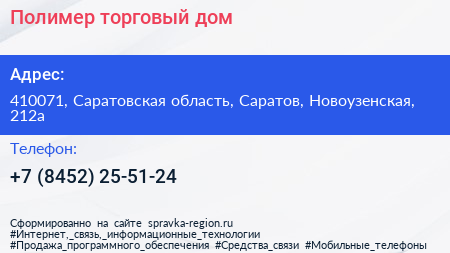 Полимер, торговый дом по адресу 410071, Саратовская область, Саратов, Новоузенская, 212а в дальнейшем Организация, размещена в следующих категориях: