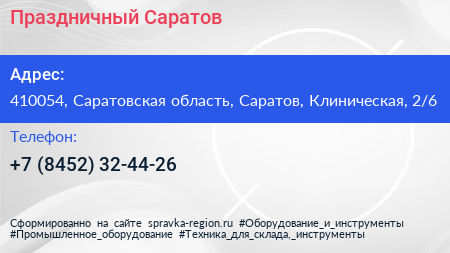 Праздничный Саратов по адресу 410054, Саратовская область, Саратов, Клиническая, 2/6 в дальнейшем Организация, размещена в следующих категориях: