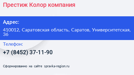 Престиж-Колор, компания по адресу 410012, Саратовская область, Саратов, Университетская, 36 в дальнейшем Организация, размещена в следующих категориях: