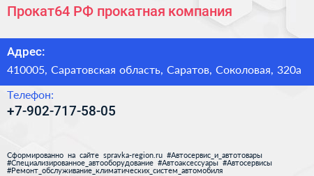 Прокат64.РФ, прокатная компания по адресу 410005, Саратовская область, Саратов, Соколовая, 320а в дальнейшем Организация, размещена в следующих категориях: