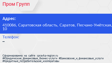Пром Групп по адресу 410086, Саратовская область, Саратов, Песчано-Умётская, 10 в дальнейшем Организация, размещена в следующих категориях: