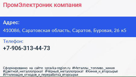 ПромЭлектроник, компания по адресу 410086, Саратовская область, Саратов, Буровая, 26 к5 в дальнейшем Организация, размещена в следующих категориях: