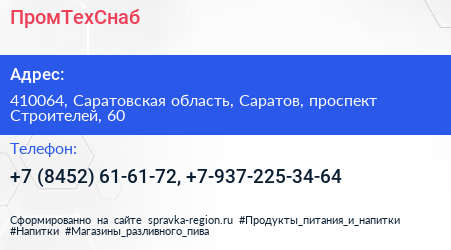 ПромТехСнаб по адресу 410064, Саратовская область, Саратов, проспект Строителей, 60 в дальнейшем Организация, размещена в следующих категориях: