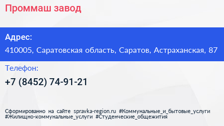 Проммаш, завод по адресу 410005, Саратовская область, Саратов, Астраханская, 87 в дальнейшем Организация, размещена в следующих категориях: