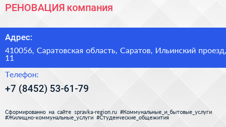 РЕНОВАЦИЯ, компания по адресу 410056, Саратовская область, Саратов, Ильинский проезд, 11 в дальнейшем Организация, размещена в следующих категориях: