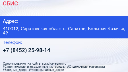 СБИС по адресу 410012, Саратовская область, Саратов, Большая Казачья, 49 в дальнейшем Организация, размещена в следующих категориях: