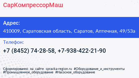 СарКомпрессорМаш по адресу 410009, Саратовская область, Саратов, Аптечная, 49/53а в дальнейшем Организация, размещена в следующих категориях: