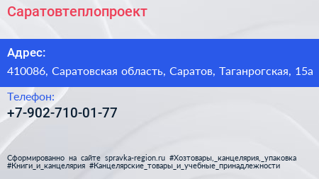 Саратовтеплопроект по адресу 410086, Саратовская область, Саратов, Таганрогская, 15а в дальнейшем Организация, размещена в следующих категориях: