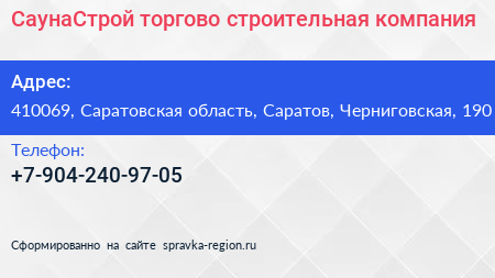 СаунаСтрой, торгово-строительная компания по адресу 410069, Саратовская область, Саратов, Черниговская, 190 в дальнейшем Организация, размещена в следующих категориях: