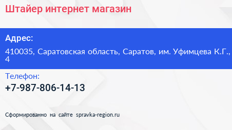 Штайер, интернет-магазин по адресу 410035, Саратовская область, Саратов, им. Уфимцева К.Г., 4 в дальнейшем Организация, размещена в следующих категориях: