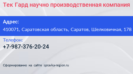 Тек Гард, научно-производственная компания по адресу 410071, Саратовская область, Саратов, Шелковичная, 178 в дальнейшем Организация, размещена в следующих категориях: