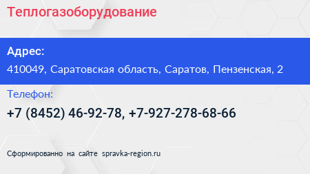 Теплогазоборудование по адресу 410049, Саратовская область, Саратов, Пензенская, 2 в дальнейшем Организация, размещена в следующих категориях: