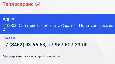 Теплосервис 64 по адресу 410008, Саратовская область, Саратов, Политехническая, 2 в дальнейшем Организация, размещена в следующих категориях:
