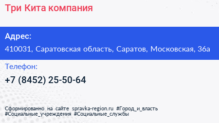 Три Кита, компания по адресу 410031, Саратовская область, Саратов, Московская, 36а в дальнейшем Организация, размещена в следующих категориях: