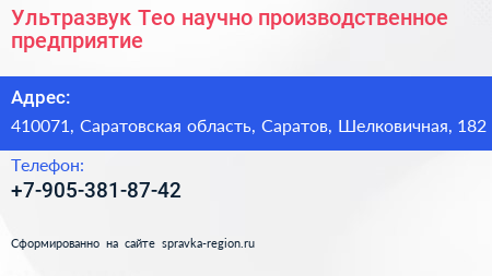 Ультразвук Тео, научно-производственное предприятие по адресу 410071, Саратовская область, Саратов, Шелковичная, 182 в дальнейшем Организация, размещена в следующих категориях: