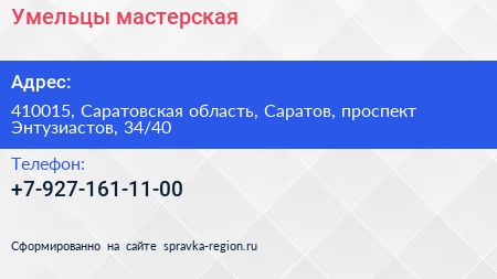 Умельцы, мастерская по адресу 410015, Саратовская область, Саратов, проспект Энтузиастов, 34/40 в дальнейшем Организация, размещена в следующих категориях: