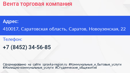 Вента, торговая компания по адресу 410017, Саратовская область, Саратов, Новоузенская, 22 в дальнейшем Организация, размещена в следующих категориях: