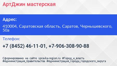 АртДжин, мастерская по адресу 410004, Саратовская область, Саратов, Чернышевского, 50а в дальнейшем Организация, размещена в следующих категориях: