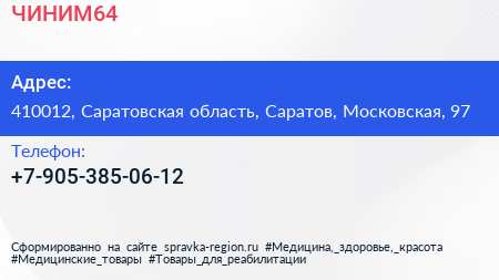 #ЧИНИМ64 по адресу 410012, Саратовская область, Саратов, Московская, 97 в дальнейшем Организация, размещена в следующих категориях: