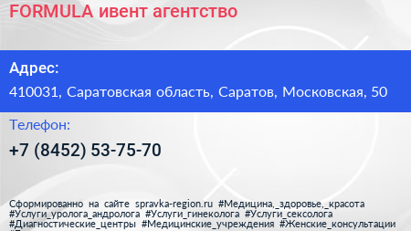 FORMULA, ивент-агентство по адресу 410031, Саратовская область, Саратов, Московская, 50 в дальнейшем Организация, размещена в следующих категориях: