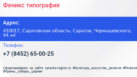 Феникс, типография по адресу 410017, Саратовская область, Саратов, Чернышевского, 94 к4 в дальнейшем Организация, размещена в следующих категориях: