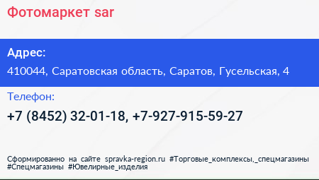 Фотомаркет.sar по адресу 410044, Саратовская область, Саратов, Гусельская, 4 в дальнейшем Организация, размещена в следующих категориях: