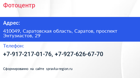 Фотоцентр по адресу 410049, Саратовская область, Саратов, проспект Энтузиастов, 29 в дальнейшем Организация, размещена в следующих категориях: