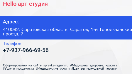 Hello, арт-студия по адресу 410082, Саратовская область, Саратов, 1-й Топольчанский проезд, 7 в дальнейшем Организация, размещена в следующих категориях: