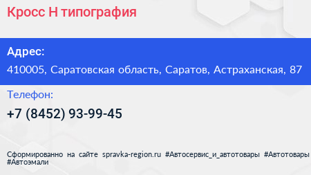 Кросс-Н, типография по адресу 410005, Саратовская область, Саратов, Астраханская, 87 в дальнейшем Организация, размещена в следующих категориях: