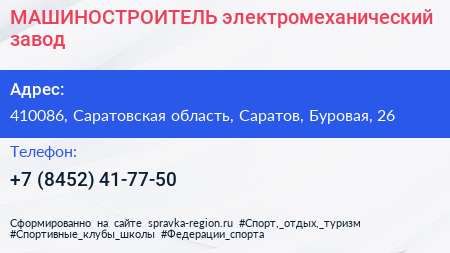 МАШИНОСТРОИТЕЛЬ, электромеханический завод по адресу 410086, Саратовская область, Саратов, Буровая, 26 в дальнейшем Организация, размещена в следующих категориях: