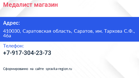 Медалист, магазин по адресу 410030, Саратовская область, Саратов, им. Тархова С.Ф., 46а в дальнейшем Организация, размещена в следующих категориях: