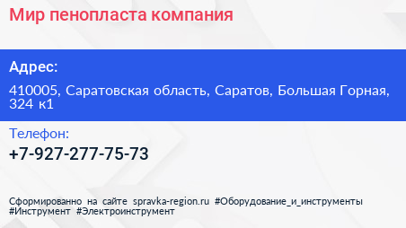 Мир пенопласта, компания по адресу 410005, Саратовская область, Саратов, Большая Горная, 324 к1 в дальнейшем Организация, размещена в следующих категориях: